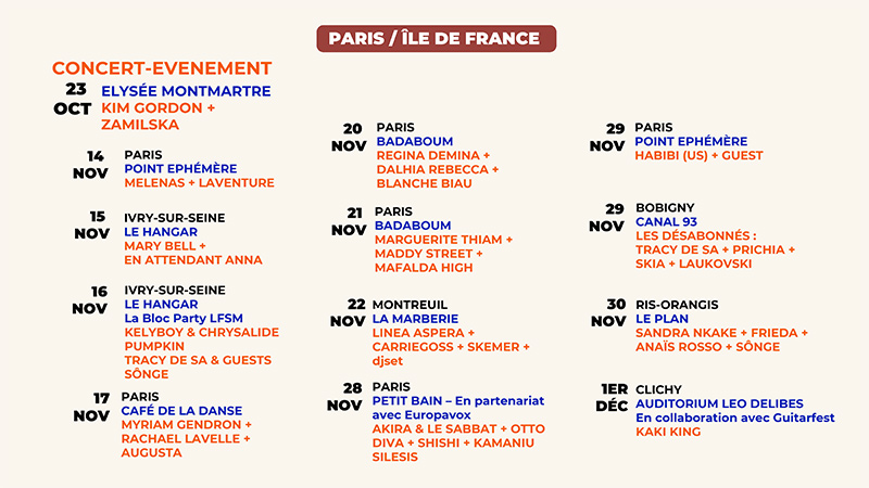 Les Femmes s’en mêlent fêtent leurs 25 ans News by David Servant - 9 octobre 2024 Voici un rendez-vous auquel nous sommes fidèles depuis 20 ans, mais qui avait commencé encore plus tôt, au siècle dernier ! Festival visionnaire, les Femmes s’en mêlent fête aujourd’hui ses 25 ans, avec une nouvelle édition placée sous le signe de la rencontre, du partage, de l’engagement et de l’émotion. Depuis le 8 mars 1997, date de la première édition, le monde a beaucoup changé. La société a considérablement évolué, augmentant la visibilité et la prise de parole des artistes femmes. Plusieurs générations sont passées par le festival, dessinant au fil des décennies une nouvelle cartographie où musiciennes, autrices et compositrices apportent leur vision renouvelée du monde. Celle qui arrive bouscule toujours plus les codes et les genres. En collectif ou en solo, les artistes redéfinissent les normes et Les Femmes S’en Mêlent, spectateur attentif et bienveillant, les accompagne dans cet élan créatif et émancipateur. Avec toujours plus de projets émergents et d’artistes françaises, nous aspirons à un futur inclusif, divers et prometteur, avec des groupes et artistes comme Akira & Le Sabbat, Maddy Street, Marguerite Thiam, Carriegoss, Dalhia Rebecca, Laventure, Dog Park, Augusta, Blanche Biau, Madam… Mais le coup d’envoi de cette édition sera donné d’une façon magistrale avec la venue exceptionnelle de Kim Gordon pour son unique date en France, signe du retour de l’underground et de l’indie-pop avec également le groupe de Brooklyn Habibi, les espagnoles Melenas ou les française Mary Bell. Nous aurons aussi la chance d’accueillir une des voix les plus envoûtantes et singulières de la scène folk contemporaine : la Québécoise Myriam Gendron. Fidèle à son ADN, le festival est toujours animé par son désir de fédérer à travers les concerts, rencontres et ateliers et reste un soutien indéfectible à celles qui transforment le paysage musical pour une scène plus diversifiée et inclusive. Pour plus d’infos : https://lfsm.net/ https://www.instagram.com/lesfemmesenmelent/ https://www.facebook.com/lesfemmesenmelent https://twitter.com/femmesenmelent Articles similaires :LES FEMMES S’EN MELENT #19HURRAY FOR THE RIFF RAFF -…Les Femmes S'en Mêlent #22 : les…ANGEL OLSEN - Festival Les Femmes…BEAU - Festival Les Femmes s'en…KANDLE - Festival Les Femmes S'en…
