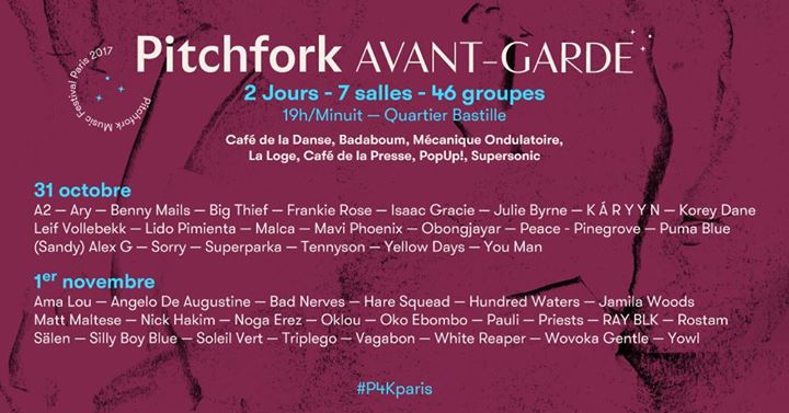 PITCHFORK AVANT-GARDE 2017 : La programmation complète! News by David Servant - 9 septembre 2017 En marge du festival Pitchfork à la grande Halle de la Villette, Pitchfork Avant-Garde reviendra les 31 octobre et 1er novembre pour une nouvelle promenade nocturne dans 7 salles emblématiques autour de Bastille : le Café de la Danse, le Badaboum, la Mécanique Ondulatoire, la Loge, le Café de la Presse, le PopUp! et le Supersonic. En guise d’échauffement, le festival vous propose de déambuler pendant 2 jours dans les 11e et 12e arrondissements pour découvrir la nouvelle garde indé avec pas moins de 46 concerts. Pitchfork Avant-Garde invite pour vous les pépites musicales du moment, les talents émergents de la scène française et internationale : avis aux amateurs de rock, pop, électro ou R’n’B ! La programmation : 31 octobre : A2 Ary Benny Mails Big Thief Frankie Rose Isaac Gracie Julie Byrne K Á R Y Y N Korey Dane Leif Vollebekk Lido Pimienta Malca Mavi Phoenix Obongjayar Peace Pinegrove Puma Blue (Sandy) Alex G Sorry Superparka Tennyson Yellow Days You Man 1er novembre : Ama Lou Angelo De Augustine Bad Nerves Hare Squead Hundred Waters Jamila Woods Matt Maltese Nick Hakim Noga Erez Oklou Oko Ebombo Pauli Priests RAY BLK Rostam Sälen Silly Boy Blue Soleil Vert Triplego Vagabon White Reaper Wovoka Gentle Yowl Pour plus d’infos : https://pitchforkmusicfestival.fr/pitchfork-avant-garde/ Articles similaires :Pitchfork Festival Paris 2025 : la…Pitchfork Avant-Garde : la…Katy J Pearson - Festival…LUCY DACUS - La Mécanique…Wel Leg - Festival Rock en Seine -…Wet Leg - Festival Pitchfork…